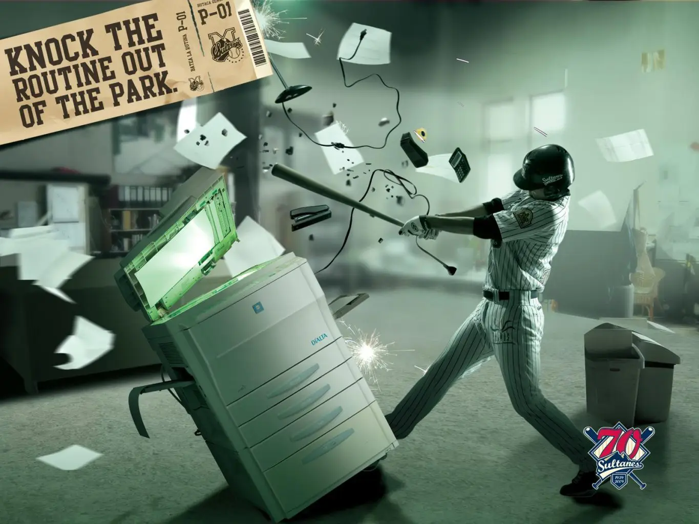 What a smash! Powerful office scene for a baseball advertising! The explosion effect with the supplies is amazing!